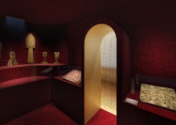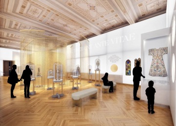 První řešený sál pro kurátorský okruh Rituály a slavnosti byl navržen jako čistý prostor obklopený světlem, ve kterém by se návštěvníci skrze samostojné vitríny a interaktivní výsuvné panely dopracovali do samotného srdce místnosti tzv. kaple s nejcennějšími exponáty.